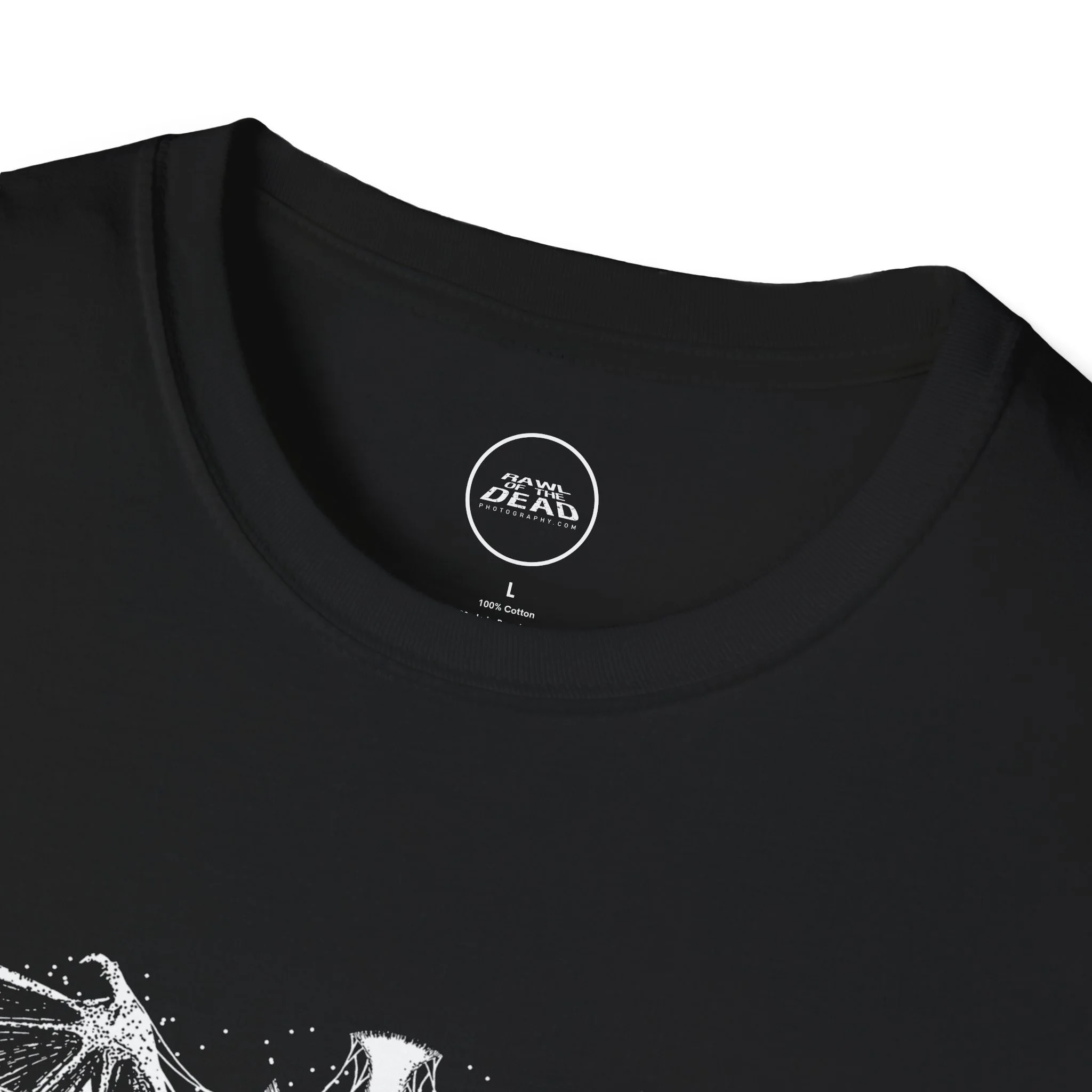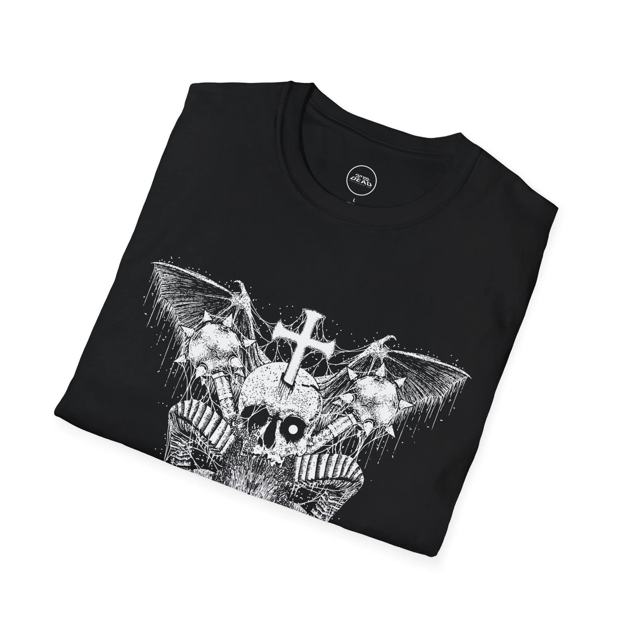 This black crewneck tee carries a dark, detailed illustration that reads like a page torn from a graphic novel — layered skulls, horned silhouettes and a faint gothic cross emerge in stark white against deep black. Lightweight and supremely soft, the shirt drapes cleanly for a classic, relaxed look. It slips into the wardrobe of someone who prefers moody, art-driven pieces: wear it under a leather jacket for shows, pair it with worn denim on late-night walks, or let it anchor a minimalist, monochrome outfit when you want the art to speak. The print’s high-contrast detail holds up wash after wash, and the tear-away label keeps the neckline comfortable for all-day wear.